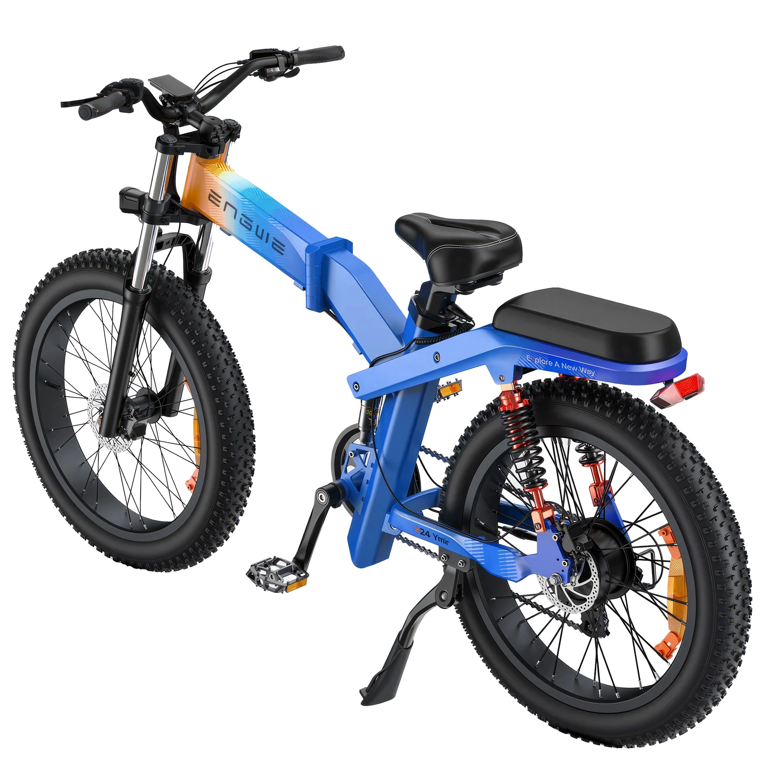 Cu furca hidraulică față și suspensia spate cu arc, ENGWE X24 oferă o absorbție excepțională a șocurilor. Acest sistem de suspensie dublă, combinat cu anvelopele grase de 24" x 4.0", asigură o deplasare lină și confortabilă pe pietriș, zăpadă și nisip, oferind încredere și stabilitate pe orice suprafață.